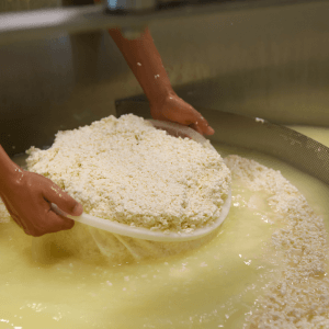 The whey is separated from the curds through drainage, often on specialized curd tables. The curds are then pressed to expel additional whey and shape the cheese.
